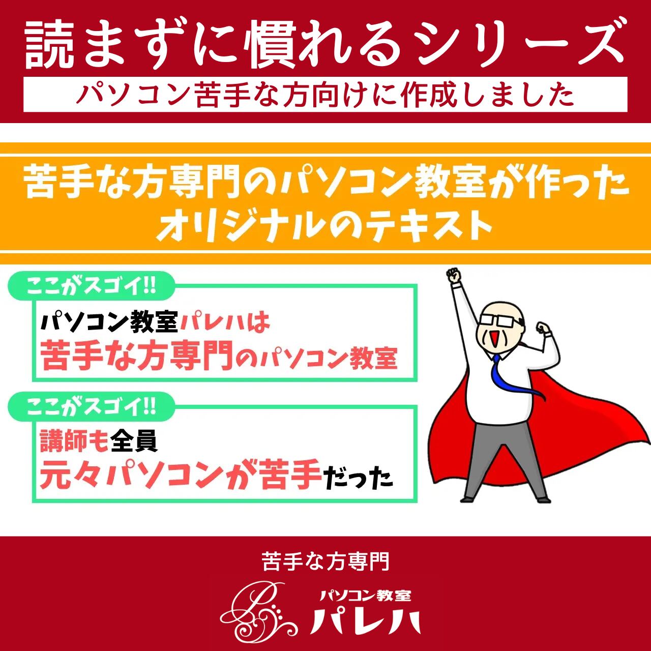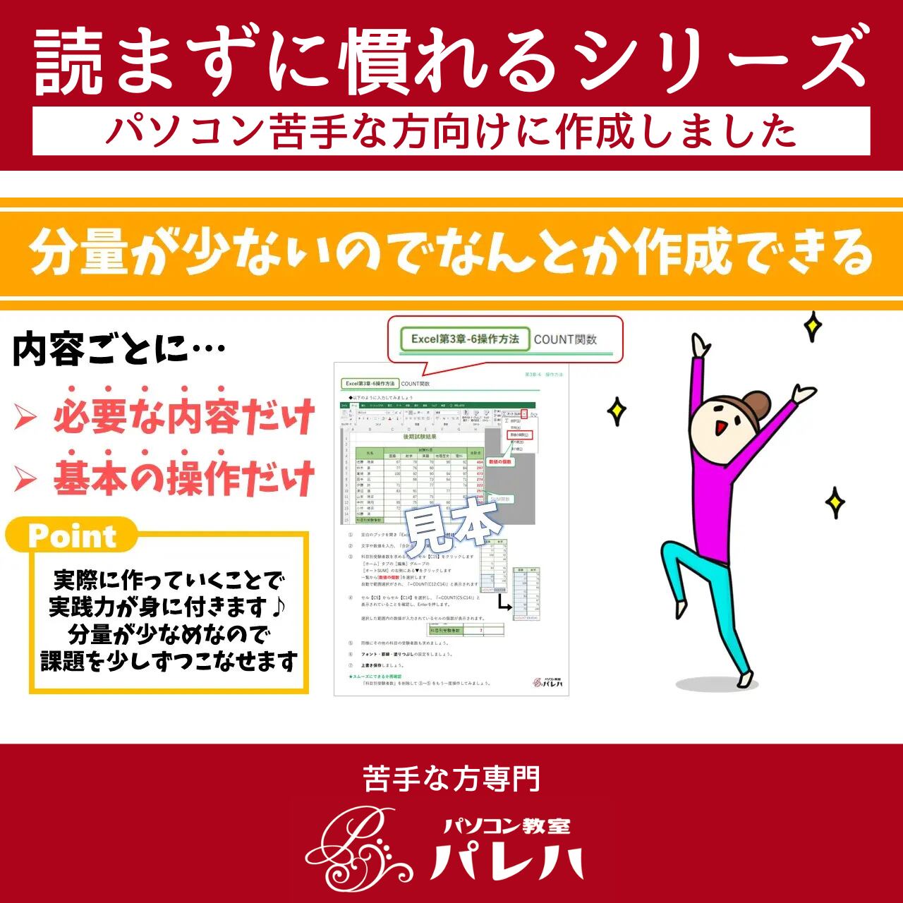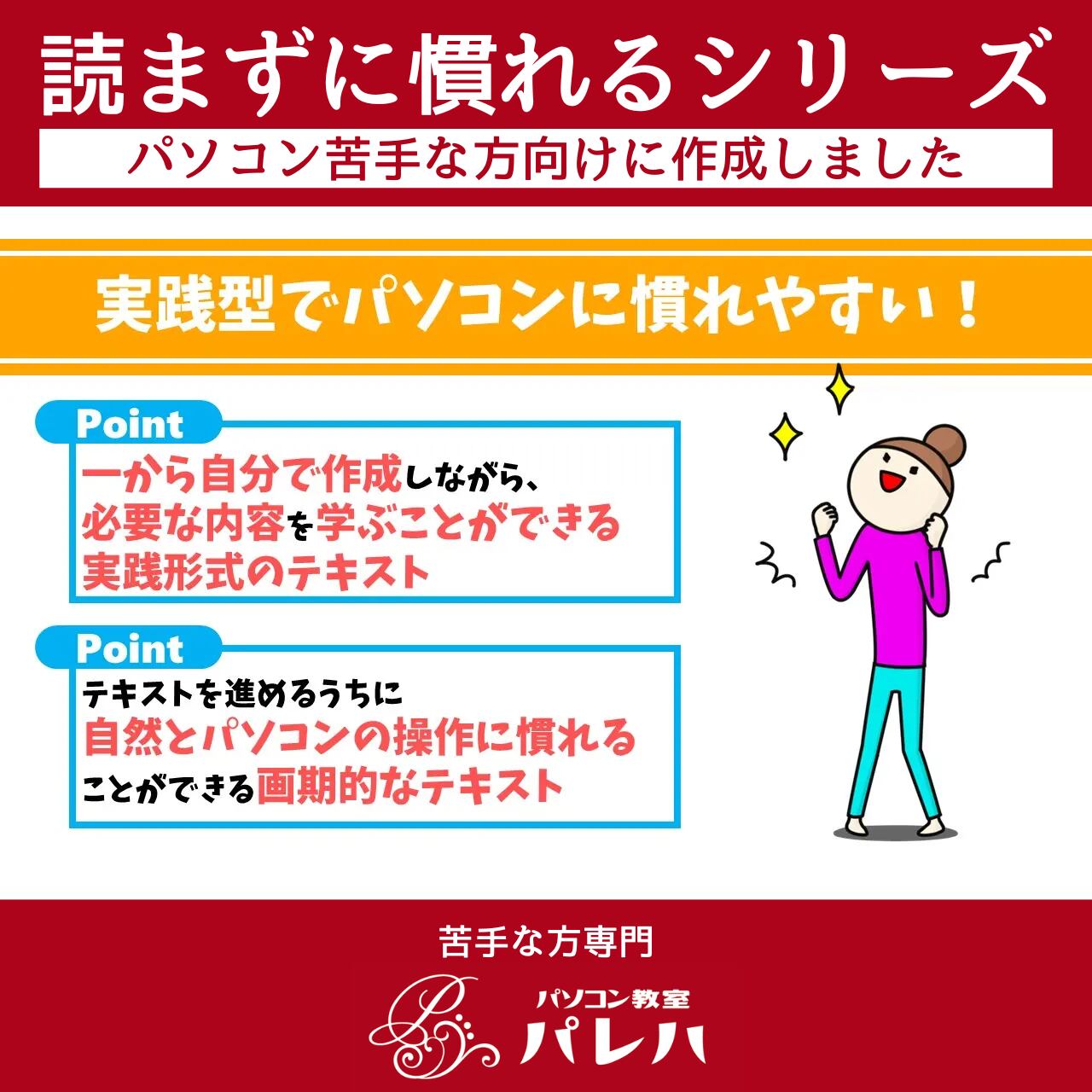 「読まずに慣れるシリーズ|Excel(エクセル)第4章|苦手な方専門パソコン教室パレハ」は、パソコンやExcel(エクセル)に自信がない方に向けて開発された特別なテキストです。