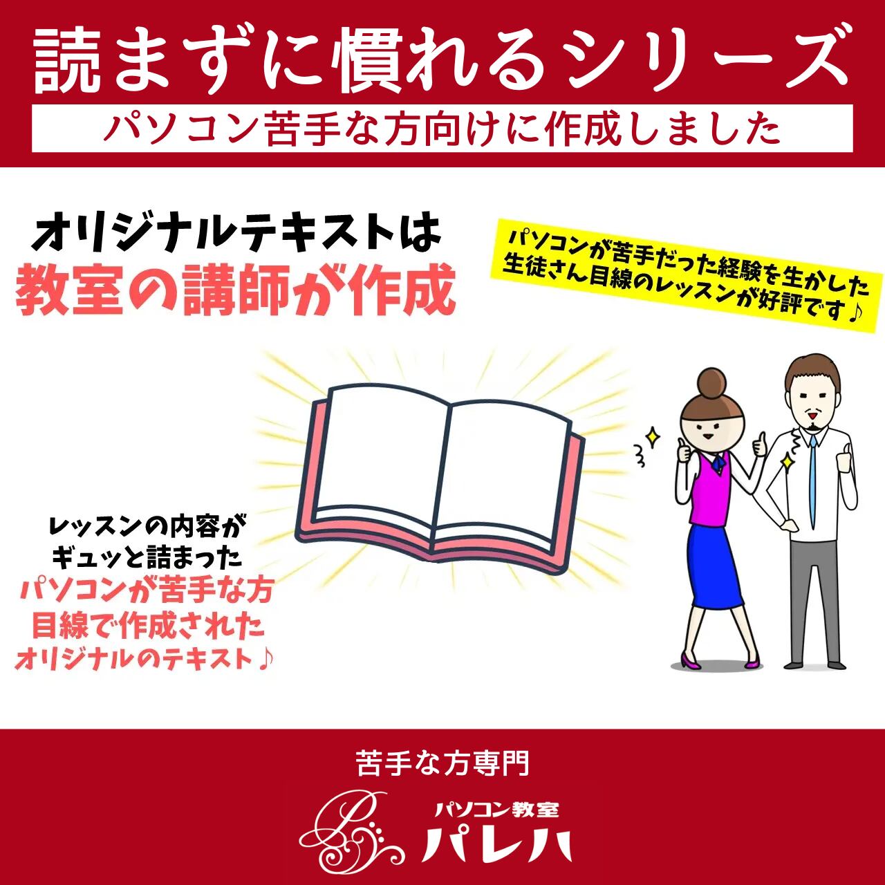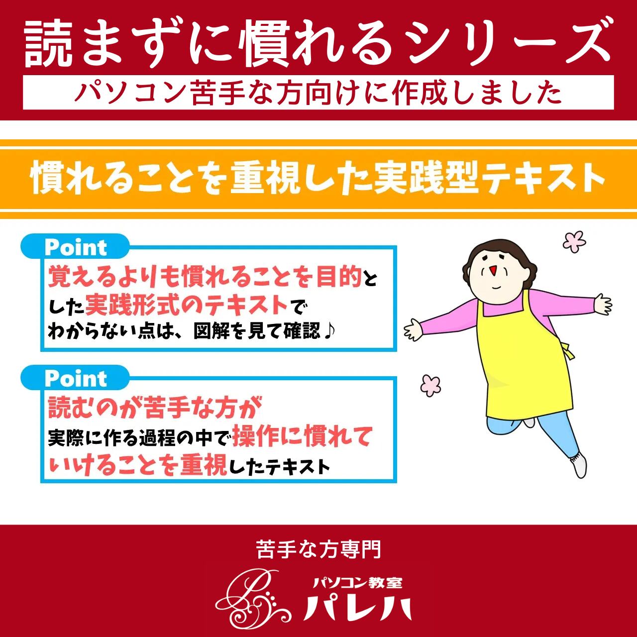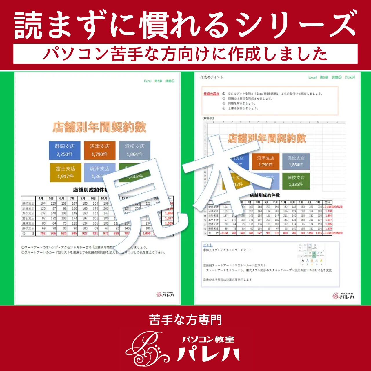 「読まずに慣れるシリーズ|Excel(エクセル)第5章|苦手な方専門パソコン教室パレハ」は、パソコンやExcel(エクセル)に自信がない方に向けて開発された特別なテキストです。